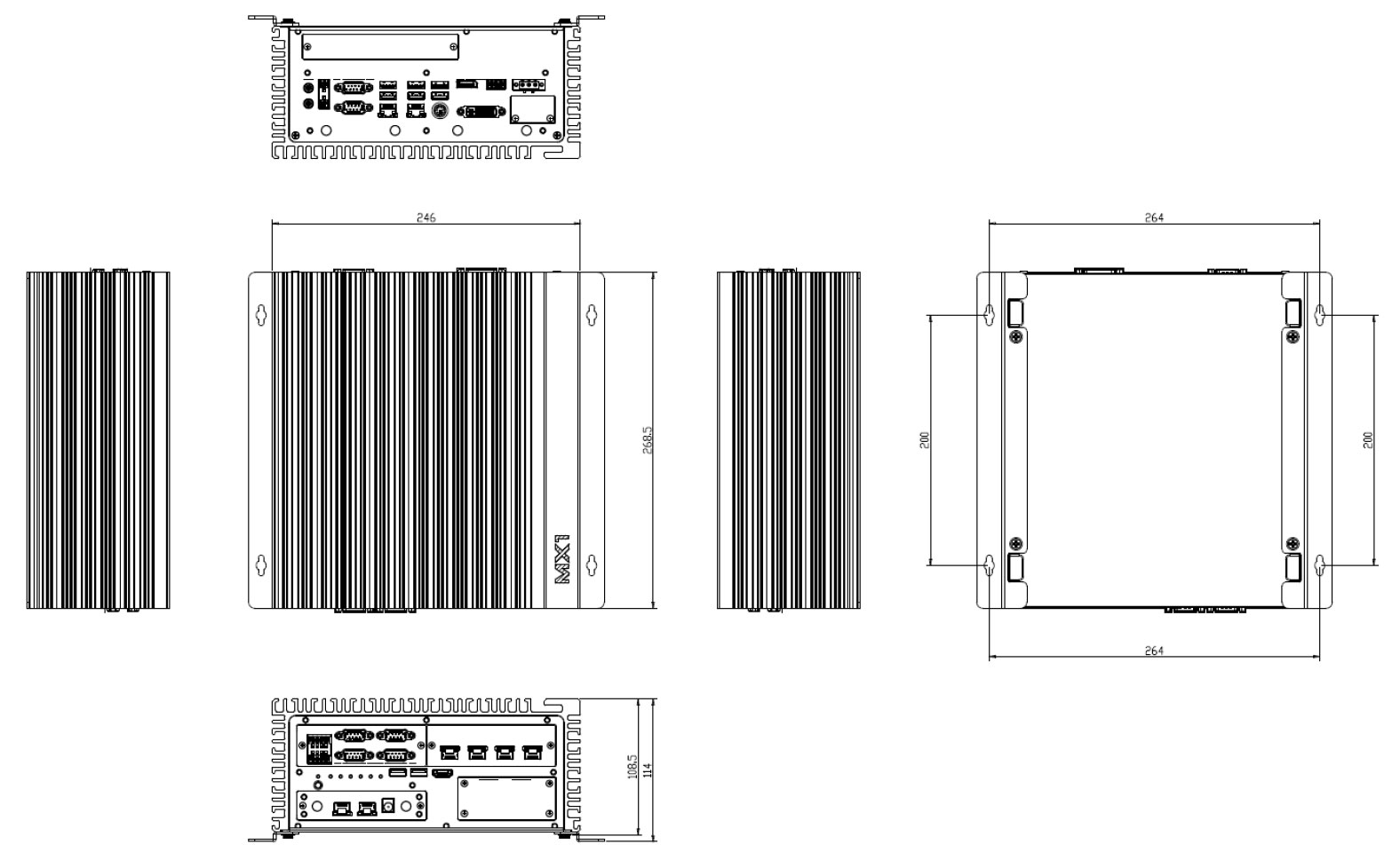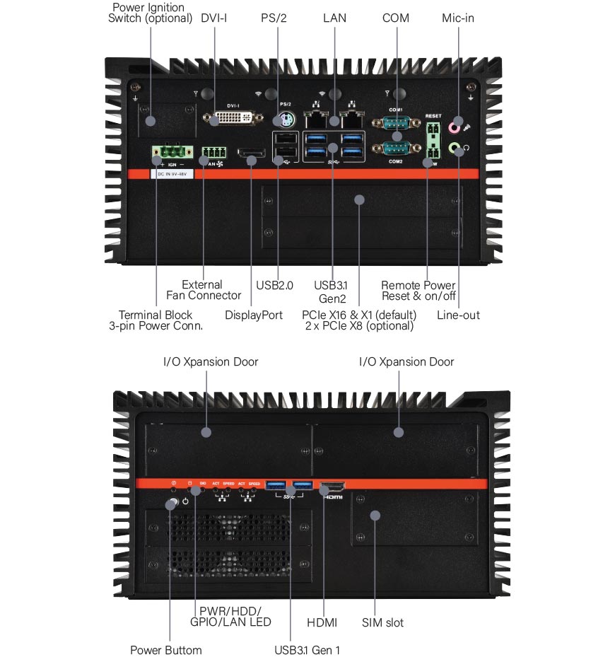 REAR I/O | 1 x DisplayPort 1.2 / 1 x DVI-I / 2 x RJ-45 / 4 x USB 3.1 Gen 2 (10 Gbps) / 2 x USB 2.0 / 2 x RS232 / 422 / 485 (Support Power 5V / 12V) / 1 x Mic-in / 1 x Line-out / 1 x 2-pin Terminal Block Remote Power Reset / 1 x 3-pin Terminal Block Power Input / 1 x 4-pin Terminal Block External Fan Connector / 1 x 2-pin Terminal Block Remote Power on / off / 4 x SMA Antenna (Optional for WiFi/LTE function) | ||